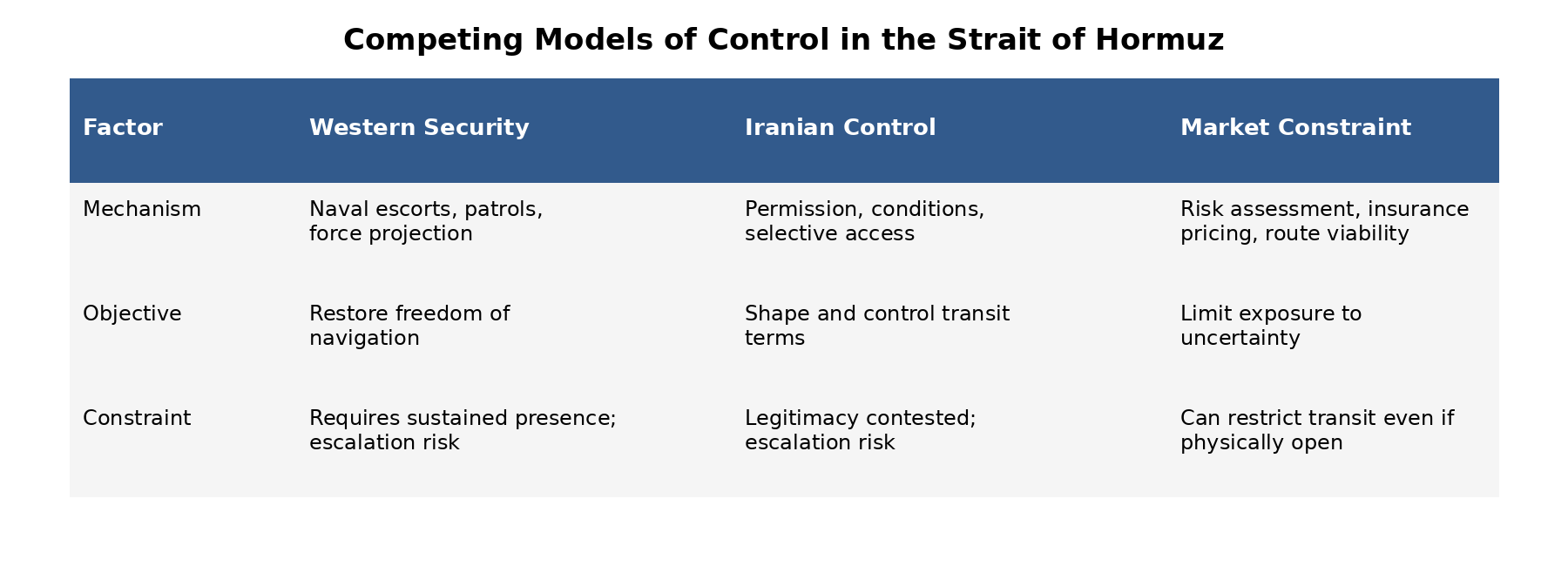 There are several approaches to Hormuz that could emerge to ensure safe passage. Early in the conflict, the U.S. appealed for a naval presence with escorts in a Western security approach. This approach would aim to restore transit through security provisions and force projection. Iran still holds procedural leverage over the Strait. The Iranian approach controls the process through granting permission and setting conditions for transit. Although movement occurs, it is Iran that sets the terms. Beyond states, market forces also determine transit as insurance companies require confidence that the level of risk does not pose a direct threat. Insurance companies will also need to agree to the terms set by Iran and the U.S., and these terms may not meet insurance standards.