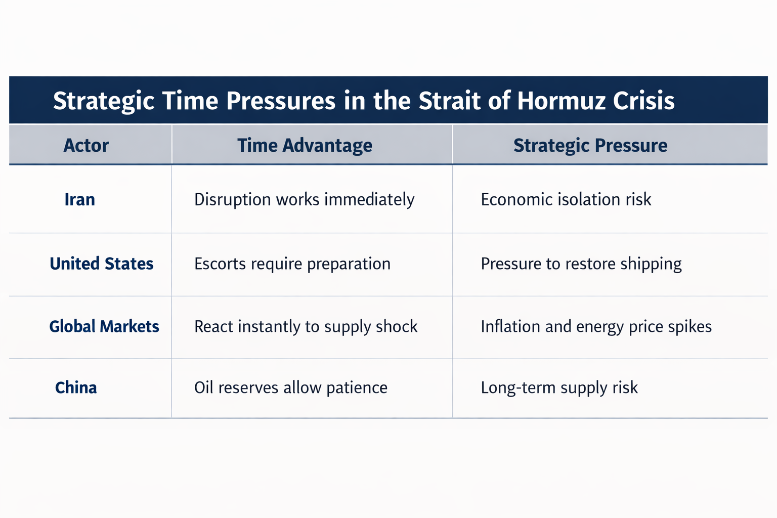 The Iranian strategic Strait disruption creates a time dilemma for the U.S. as it moves to mitigate the risk. The advantage of the disruption is that it applies rapid pressure that requires a timely naval response. It is unlikely that joint naval escorts will appear before the end of the month, as an operation of this level requires coordination of an array of naval vessels and air support. As it may also be a multilateral approach, further coordination with European and Gulf allies adds another level to the challenge. The European willingness to commit naval vessels suggests that European leaders are concerned with the economic impact, and they are looking for an efficient solution. Other global actors reliant on oil flows, such as China, may also apply pressure on Iran to find a solution to the conflict zone. However, China has about three months of oil reserves and has remained diplomatically silent on the conflict to date. China may be similar to the international community; anticipating a solution can be reached prior to involvement or escalation. Essentially, the Strait dilemma is disruption vs. U.S. response time and how quickly oil flows can be reestablished and economic impacts reduced.